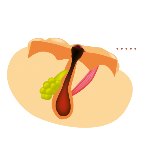 | Toinen tärkeä aknen aiheuttaja on hyperkeratinisaatio, karvatuppien toimintahäiriö jossa karvatupen kuolleet ihosolut sitoutuvat toisiinsa ja tukkivat huokoset. Tämä aiheuttaa komedoja. | ![]() |